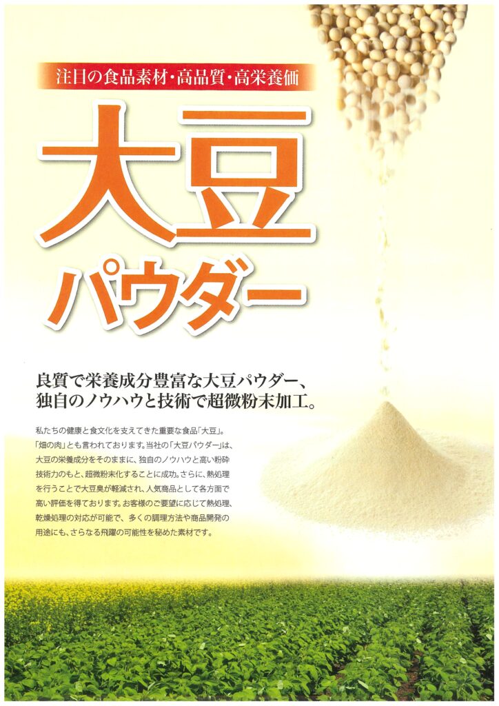 弊社が独自のノウハウと技術で微粉末加工した「大豆パウダー」は、大豆本来の栄養素と風味をそのままに、使いやすく、幅広い食品分野で応用可能な高機能素材です。